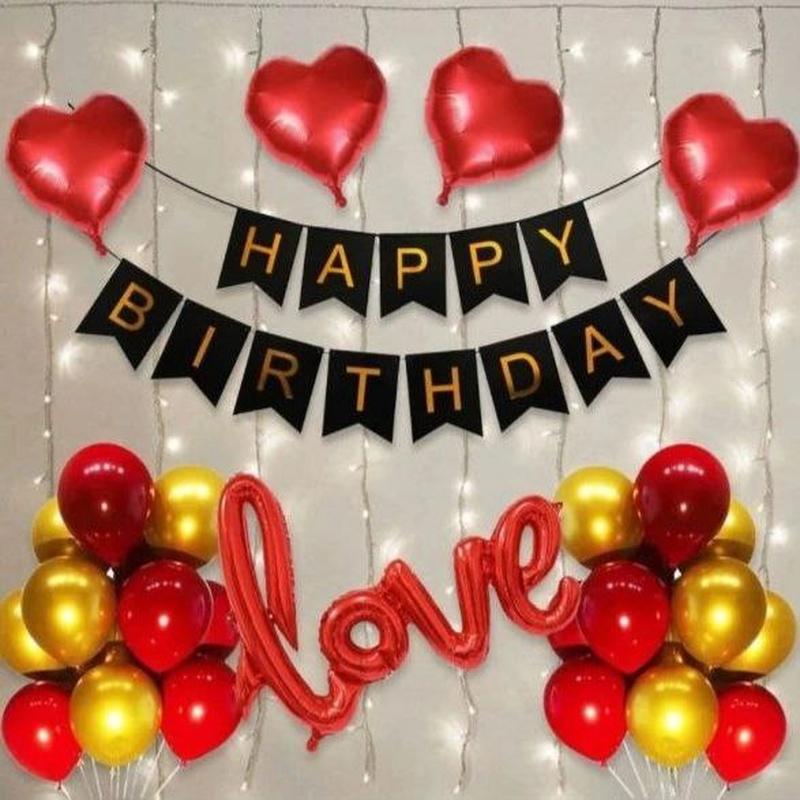 Набор воздушных шариков В набор входит: Бумажная надпись Happy birthday черный - 1 шт Фольгированная надпись Love красный - 1 ш Фольгированный шарик Сердце красное 45 см - 4 шт Латексный шар дабл стаф красный на черном 25 см - 10 шт Латексный шар золото хром 25 см - 10 шт Клеевые точки 20 шт Лента 10 м