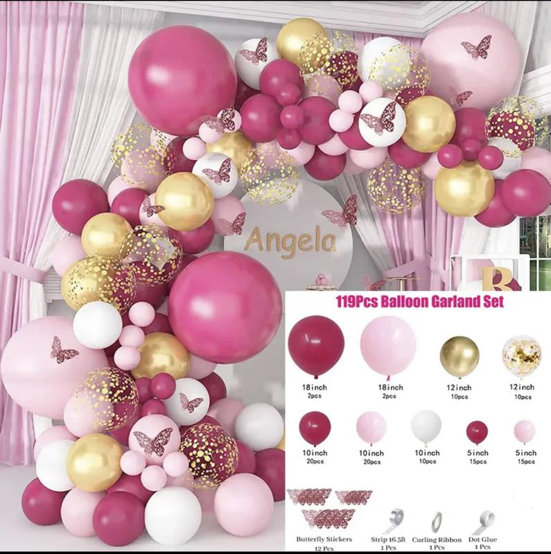 ФОТОЗОНА с бабочками набор шариков для украшения фотозоны арка из 119 элементов (шариков 104 шт., 12 бабочек разных размеров). Такой набор из шариков малинового, розового, белого, золотого цвета и 12 бабочек разных размеров. В набор композиций входит: 119 элементов - 10 шт бежевых с конфетти шариков - 30 см (12 дюймов); - 2 шт малинового цвета шариков - 45 см (18 дюймов); - 20 шт малинового цвета шарики-25 см (10 дюймов) - 15 шт малинового цвета шарики - 12 см (5 дюймов) - 10шт золотистых шариков - 30см ( 12 дюймов) - 10 шт белых шариков - 25см (10 дюймов) - 2 шт розовых шариков - 45 см (18 дюймов); - 20 шт розовых шариков - 25 см ( 10дюймов) - 15 шт розовых шариков - 12см (5 дюймов) - 12 шт декоративных бабочек (маленькие-4шт, средние-4шт, большие-4шт) - 1шт лента с силиконовыми точками для скрепления конструкции (100шт силиконовых точек) - 1шт. Пластиковая лента для скрепления конструкции с воздушными шарами