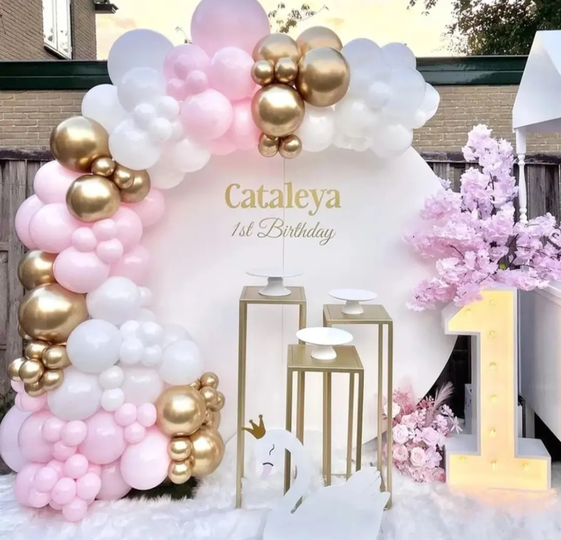 2 шт кульки рожеві 48 см 1 шт кулька біла 48 см 11 шт кульки хром золото 26 см 17 шт кульки хром золото 13 см 25 шт кульки білі 26 см 25 шт кульки рожеві 26 см 15 шт кульки білі 13 см 20 шт кульки рожеві 13 см Пластикова стрічка для швидкого монтажу арки Клейові гель-крапки упаковка 100 шт