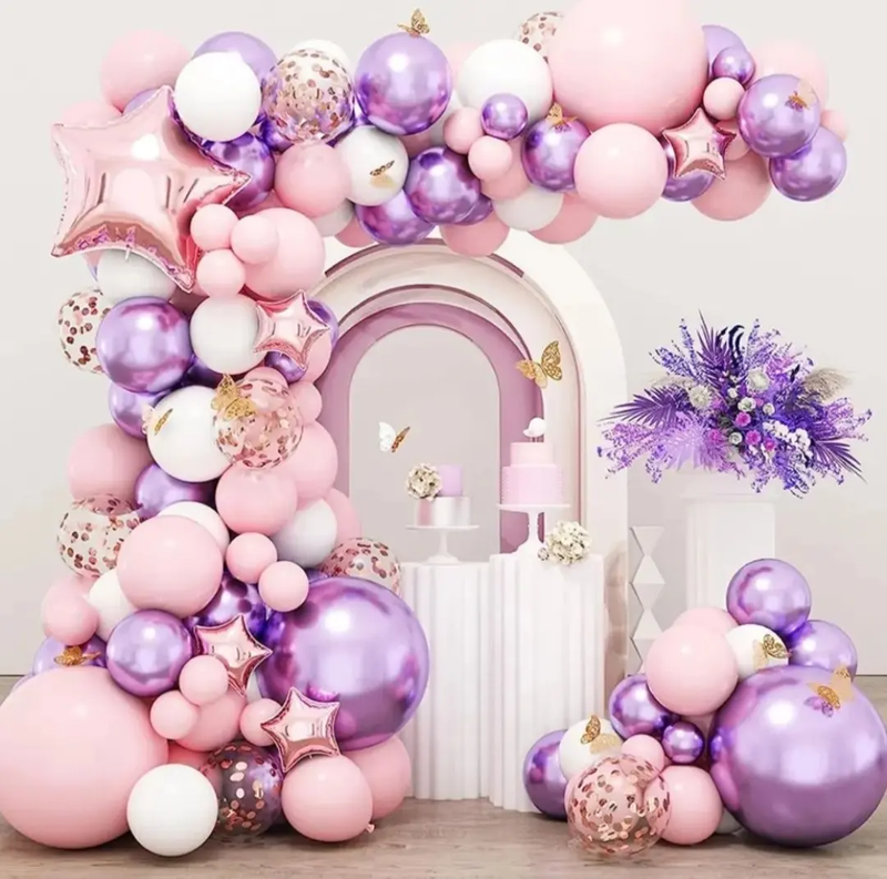 2 шт шарика хром фиолетовый 48 см 2 шт шарика розовые 48 см 8 шт шарика с конфетти розовое золото 30 см 20 шт шарика хром фиолетовый 26 см 4 шт шарика хром фиолетовый 13 см 15 шт шарика белые 26 см 30 шт шарика розовые 26 см 15 шт шарика розовые 13 см 1 шт звезда фольгированная 45 см 4 шт звезды фольгированные 25 см Пластиковая лента для быстрого монтажа арки Клеевые гель-точки упаковка 100 шт