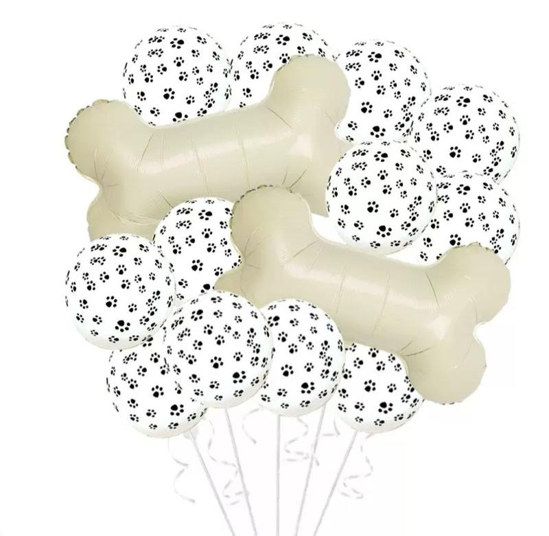 Набор воздушных шариков Косточки и лапки В набор входит: Фольгированная фигура Косточка - 2 шт Латексный шар белый с черным отпечатком лапки 30 см - 12 шт