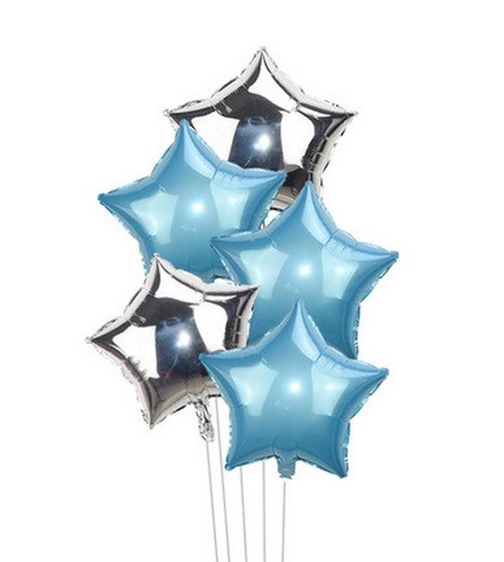 ## Набор воздушных шаров ## В набор входит: Звезды фольгированные 45 см 5 шт (2 серебро, 3 голубые) Высокое качество. Подойдут для наполнения воздухом или гелием, создания декораций, фотозон и др. Хорошо подходят под воздух и гелий!