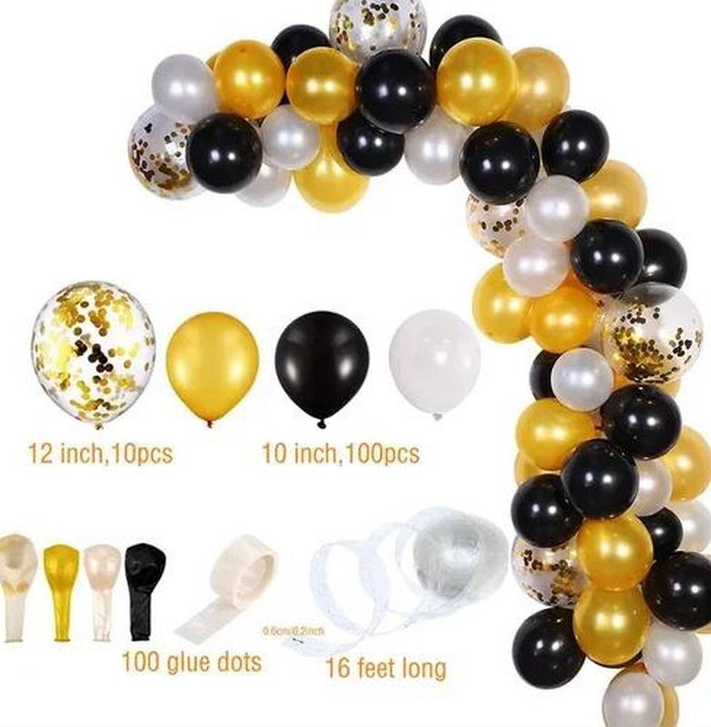 ## Комплект воздушных шаров В комплекте: - Шары латекс 25 см - черные пастель 30 шт, белые пастель 30 шт, золото металлик 30 шт - Шары латекс 30 см - прозрачные кристалл 10 шт - Конфетти кружочки 23 мм золото - 35 грамм - Двухсторонний скотч (клеевые точки 80 шт) - Пластиковая лента для создания арки, 5 метров. Цвета шариков можно заменить на другие, имеющиеся в наличии (уточните в комментарии к заказу) .