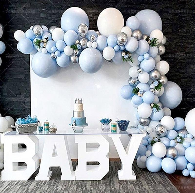 ## Комплект воздушных шаров В комплекте: - Шары латексные 25 см - 20 шт белые , голубые 10 шт - Шары латексные 13 см - 40 шт белые, голубые 30 шт - Шары 48 см - белые 6 шт, голубые 5 шт - Хром 25 см серебро 15 шт - Клеевые точки (упаковка на 80 шт) - Лента пластиковая для формирования арки (5 метров) Оттенки могут отличаться от тех, что на фото. Цвета шариков можно заменить на другие, имеющиеся в наличии (уточните в комментарии к заказу) Используйте технологию дабл стафф .