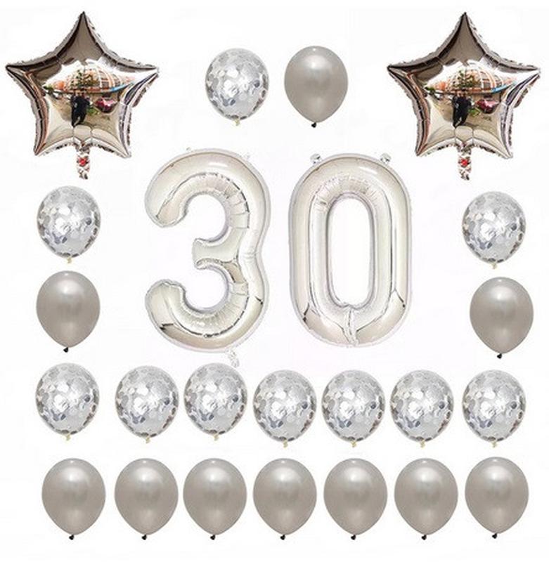 Комплектация: - Фольгированные цифры 70 см 2 шт серебро (любые на Ваш выбор) - Звезда 45 см 2 шт серебро - Латексные шарики 30 см 10 шт серебро - Латексные шарики 30 см 10 шт прозрачные с конфетти серебро Буквы можно надувать только воздухом, остальные шары подходят под воздух и гелий. Любой цвет шаров можно заменить на другой, имеющийся в наличии! Пожелания указывайте в комментарии к заказу!