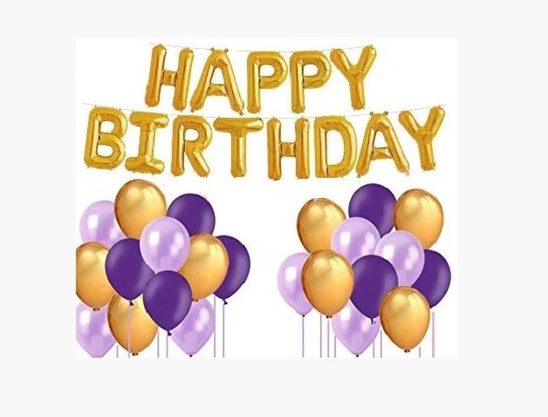 Комплектация: - Фольгированные буквы Happy Birthday золото (40 см в высоту, каждая буква отдельно, с петельками) - Латексные шарики 30 см 23 шт (7 шт пастель фиолетовые, 8 шт пастель лиловые, 8 шт металлик золото) Буквы можно надувать только воздухом, остальные шары подходят под воздух и гелий. Любой цвет шаров можно заменить на другой, имеющийся в наличии! Пожелания указывайте в комментарии к заказу!
