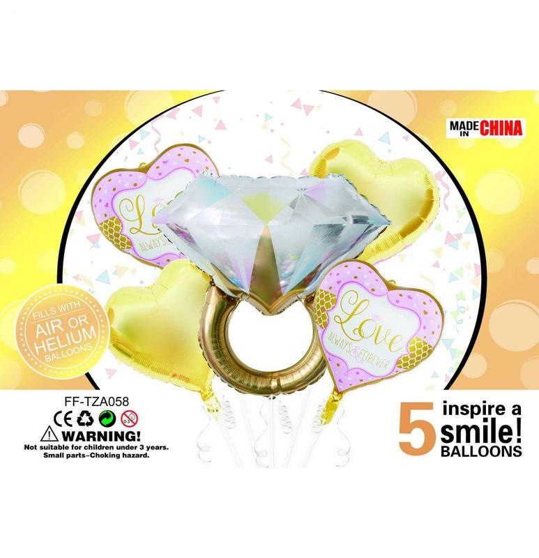 Яркий набор шариков "Кольцо". Милый и красочный комплект. В наборе 5 фольгированных шариков: 1 большой шарик в виде кольца, 4 в виде сердечек. Все шарики качественные и надежные. Возраст: 3 года Упаковка: Пакет Цвет: Желтый Вес в упаковке: 60 г Вес без упаковки: 60 г Габариты в упаковке: 1 x 24.5 x 17 см Cтрана производитель: Китай Материал: Комбинированный Комплектация: 5 шариков