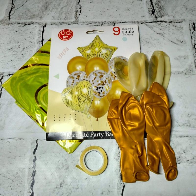 Набір з повітряних кульок. Набір "фонтан" з повітряних кульок - фольговані кульки Зірки та Серця, латексні кульки однотонні та прозорі з конфетті. Такий набір стане чудовим доповнення до головного подарунку на День народження, 14 лютого, 8 березня, Дівчвечір, Весілля. Чудово зможе прикрасити будь-яку фотозону чи приміщення! В набір входить: - Кулька латексна однотонна, золота - 4 шт, 30 см (12 дюймів) - Кулька латексна прозора з конфетті - 3 шт, 30 см (12 дюймів) - Кулька фольгована Серце Мармур, золота - 1 шт, 45 см (18 дюймів) - Кулька фольгована Зірка Мармур, золота - 1 шт, 45 см (18 дюймів) - Стрічка Підійдуть для надування повітрям або гелієм *не рекомендується дітям до 3-х років. Діти до 8 років можуть вдихнути або проковтнути не надутий або порваний кульку. Не давайте дітям не надуті кулі. Порвані або зруйновані кулі слід одразу викидати. Повітряні кулі зберігати в місцях недоступних для дітей. Латексні кулі можуть мати специфічний запах. Зберігати в темному, сухому, прохолодному місці.