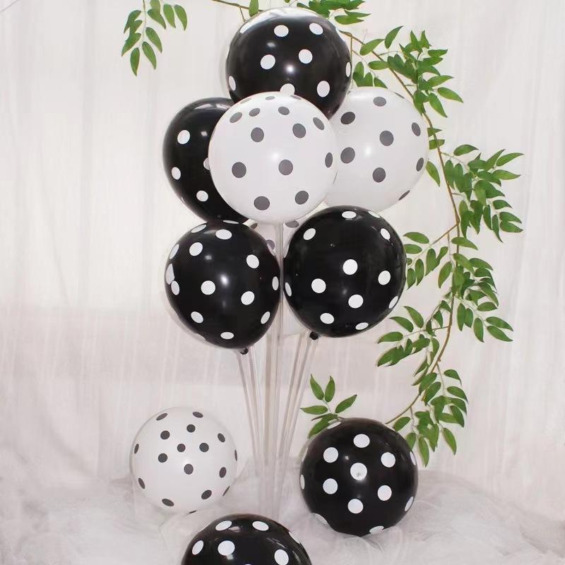 Набор шариков на подставке В набор входит: Подставка на 7 шариков высотой 70 см - 1 шт Латексный воздушный шар черный в белый горох 30 см - 4 шт Латексный воздушный шар белый в черный 30 см - 6 шт