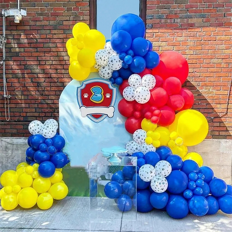 Арка из воздушных шариков Щенячий патруль В набор входит: Пластиковая лента для крепления шариков 5 м - 1 шт Воздушные шарики белые с черным отпечатком лапки 30 см - 20 шт Воздушный шарик желтая 48 см - 1 шт Воздушный шарик синяя 48 см - 1 шт Воздушный шарик красный 48 см - 1 шт Воздушный шарик синяя 25 см - 30 шт Воздушный шарик желтый 25 см - 20 шт Воздушный шарик красный 25 см - 10 шт Воздушный шарик синяя 13 см - 15 шт Воздушный шарик желтая 13 см- 15 шт Воздушный шарик красный 13 см - 5 шт Клеевые точки - 100 шт
