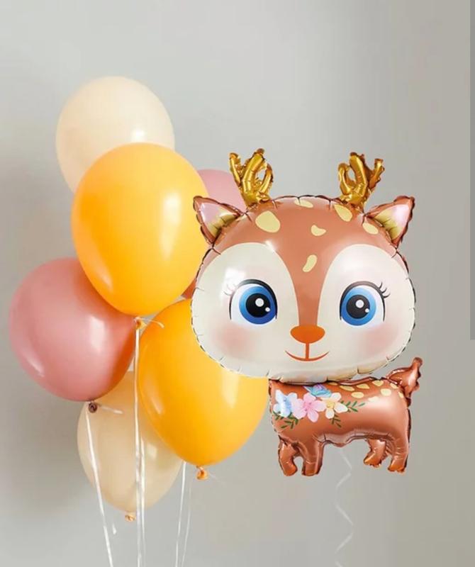 Набор воздушных шариков Оленятко В набор входит: Фольгированная фигура Олененок - 1 шт Шар пышная роза 25 см - 2 шт Пуля телесная 25 см - 2 шт Шар горчичный 25 см - 2 шт
