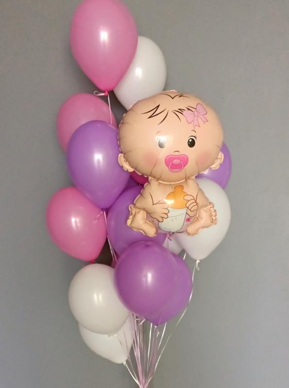 Набор воздушных шариков Girl В набор входит: Фольгированная фигура Малыш с пустышкой девочка 68 см * 45 см - 1 шт Латексна куля рожева 25 см - 4 шт Латексный шар фиолетовый 25 см - 5 шт Латексный шар белый 25 см - 5 шт