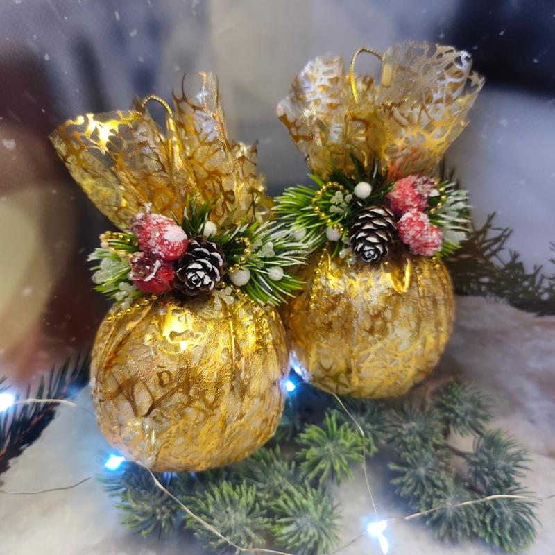 Шикарная и стильная пара рождественских шариков - это настоящее украшение любой елки!🤗🎄 Шарики выглядят стильно и дорого! Будут отличным подарком на праздники! Основа - пенопластовая, покрытые золотистой тканью, украшены стильным рождественским декором. Диаметр 8 см Праздничная коробка с наполнителем в подарок! Сделаны с любовью и позитивом!♥️🤗