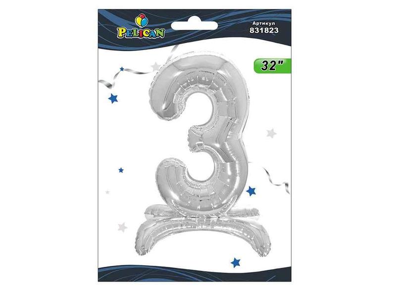 Шарик фольгированная цифра на подставке 3 срибло 80см. 831823 тм pelican