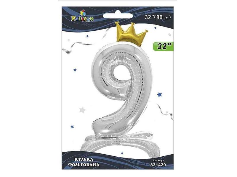 Шарик фольгированная цифра 32 (80 см) с короной на подставке 9 серебро тм pelican