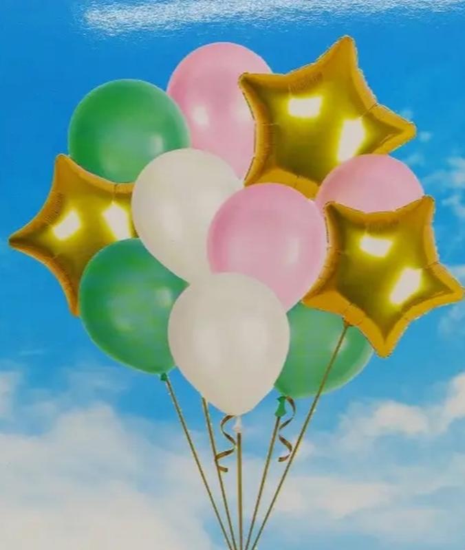 Набор воздушных шариков Звездный В набор входит: Фольгированная фигура Звезда золото 45 см - 3 шт Латексна куля рожева 25 см - 3 шт Латексный шар белый 25 см - 2 шт Латексный шар зеленый 25 см - 3 шт