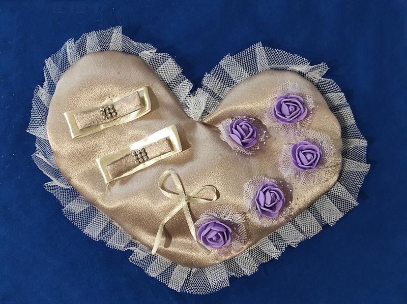 Свадебная подушечка для обручальных колец, которая используется на свадебных церемониях. Ручная работа Это аксессуар, на котором во время бракосочетания хранятся обручальные кольца. Подушечка выполнена в форме сердца, украшена лентами, искусственными фиолетовыми розами и кружевом. Кольца крепятся к лентам, расположенным на подушечке. Подобные подушечки являются частью свадебного декора и могут быть выполнены в различных стилях и цветах, чтобы гармонировать с общей тематикой свадьбы.