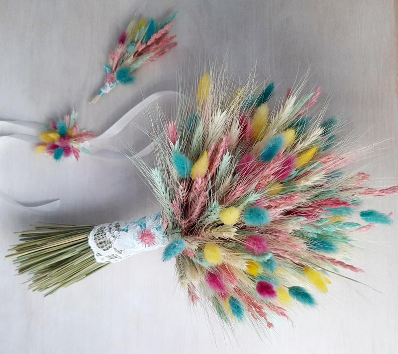 Яркий букет невесты из сухоцветов, колисков ржи, лагуруса, разнотрав ⁇ я. В букете больше трехсот колёсов! Ручная кропотливая работа. Урожай колисков 2023р. Букет в стиле рустик, прованс, яркий и жизнерадостный! Браслет и бутон ⁇ ерка входят в комплект. Браслет может быть как украшением на руку невесты, так и для подружки. Букет высотой 35 см, диаметр 22 - 23 см., бутон ⁇ ерка 12 - 13 см., браслет на атласных лентах диаметр композиции 6 - 7 см.