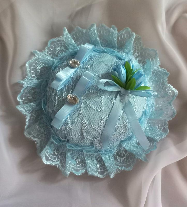 Голубая подушечка для колец жениха и невесты - ажурная подушечка под кольца на свадьбу в голубом цвете округлой формы, с нежным букетиком искусственных тюльпанов и бантиков со стразами, для фиксирования колец. Цвет - голубой