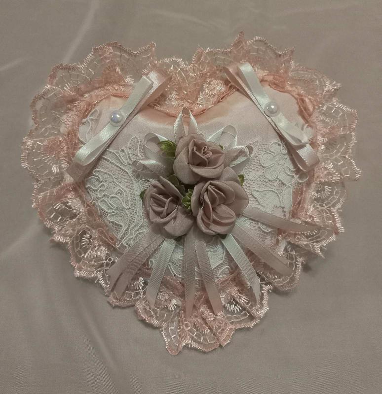 Свадебная подушка под кольца "Сердце" пудрового цвета - неотъемлемый аксессуар современной свадьбы для выноса обручальных колечек брачующимся. Лёгкая, романтичная. Свадебные кольца фиксируются на подушке путём продевания их через бантики. Выполнена в форме "сердца". Декор - атласные ленточки, кружевная оборка по краю, искусственные цветочки и флористические дополнения