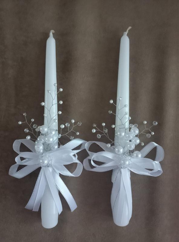 Венчальные свечи для свадьбы мод. "Хрусталь" - белые свечи ручной работы для свадьбы (при обряде зажжения свечи Семейного очага, используються свадебными мамами в качестве родительских свечей) или - для венчания, жениху и невесте. Так же, красиво будут смотреться в качестве крестильных свечей или как свеча для причастия. Декор - искусственный жемчуг, стеклярус, атласные ленты, проволока. Материал - пищевой парафин Bispol (Польша). Длина свечи - 25см, нижний диаметр - 2.5 см. Цвет свечи и декора - белый. Цена - указана за пару / 2 шт