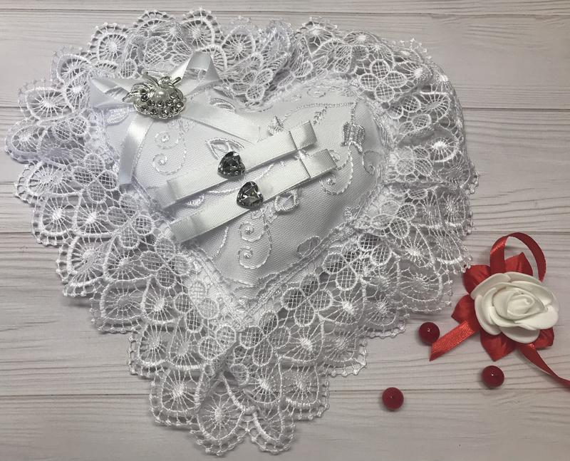 Подушечка білого кольору у формі серця. Розмір 25*25 Мереживо, декор може відрізнятись.
