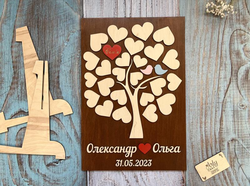 Рамка с деревом для пожеланий с вашими именами и датой свадьбы. Цена указана с тонировкой лаком и покраской (цвет может быть другой). Размер 44х30 см. Цена указана с макетом. Толщина фанеры 4 мм. Толщина подложки 8 мм. Сердечки для пожеланий по 4-6 см.