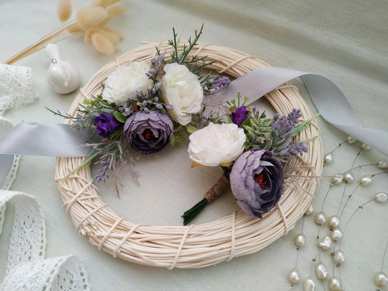 Тип весільних аксесуарів: Набори аксесуарів Вишукані, ніжні та дуже натуралістичні бутоньєрки з ранункулюсами неймовірного кольору Mauve у поєднанні з білими трояндами. Усі матеріали преміум-класу. Можливе виготовлення аксесуарів для волосся для волосся в цьому ж кольорі та стилі.