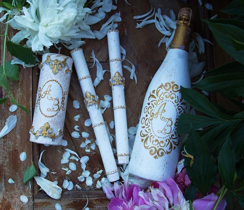 Свадебное шампанское и свечи с гербом молодых выполнены на заказ Очень оригинально будут смотреться на свадебном столе. Можно сделать на заказ в любом цвете. В тон могу изготовить любые аксессуары - бокалы, шкатулочки для колец, домик для денег, подарочные коробочки и другое для проведения свадьбы Цвет, размер, материал, стоимость, комплектность и детали обговариваются индивидуально по вашему желанию. Набор ′Семейный очаг′ для передачи семейного огня новой семье. Ну и бутылка. На свадьбе без бутылки никуда) 🔥Передача семейного огня🔥 – традиция, которая появилась в Древнем Риме. Считалось, что богиня Веста благословляет, наделяет целомудрием брачующихся, но современный обряд подразумевает передачу огня от зажжённой родительской свечи новобрачным. Как правило, мамы жениха и невесты держат две тонкие восковые свечи, а молодожены одну большую, огонь передается от одной свечи к другой.