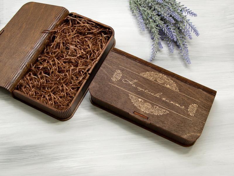 Деревянная подарочная коробка-конверт для денег на свадьбу с лазерной гравировкой для моло...