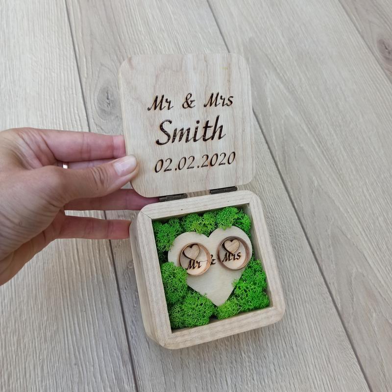 Шкатулка для обручальных колец из дерева. Ясень. Все надписи и рисунки - гравировка лазером. Наполнена в сережині зеленым стабилизированным мхом Они могут быть на любом языке и разным шрифтом. Размер шкатулки 9*9*5. Дополнительные характеристики: Форма: Квадратная Наполнитель: Мох