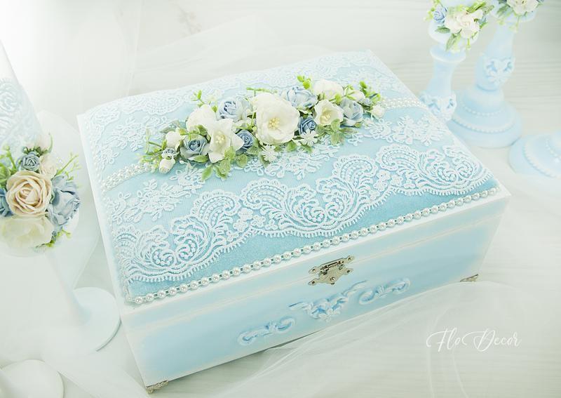 Деревянная шкатулка для денежных подарков. Размер 23/30/10см. Внутри бархатная отделка. Фурнитура металическая. Возможен повтор в другом цвете и с внесением изменений. Дополнительные характеристики: Цвет: Белый Цвет: Голубой Отделка и украшения: Бусины Отделка и украшения: Кружева Отделка и украшения: Цветы Тип: Сундук