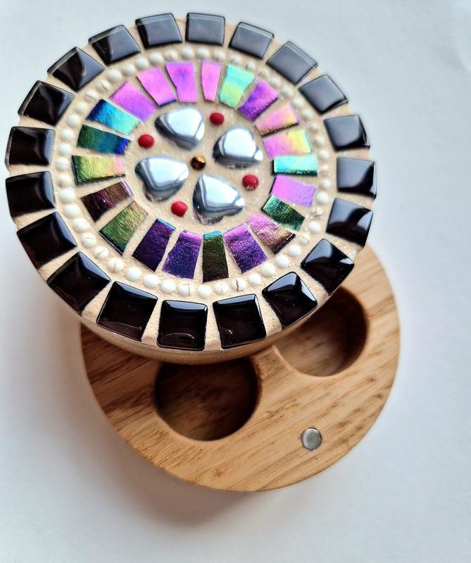 Деревянный круглый ящик для обручек ручной работы. Украшена бусинами и мозаикой. Коробочка закрывается на магниты Материал-дуб Диаметр шкатулки-8см Высота шкатулки-4см Углубление для колец-1см Диаметр выямки для колец-2,5см Такие изделия сейчас популярны, поскольку в моде натуральность. Товар изготавливается по заказу