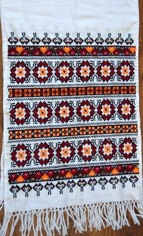 Вышитый рушник, ручная работа. Вышивка в красно-черных цветах. Орнаменты с ромбами были сильным защитным оберегом, приносили удачу. Согласно древней славянской культуре, ромбы представляют богиню Земли, которая способствует плодородию. Такое значение этого символа способствовало его большому распространению и активному использованию в орнаментах этнической одежды славянских народов. Этот рушник можно использовать как в свадебных обрядах, так и для встречи важных гостей или для украшения вашего дома.