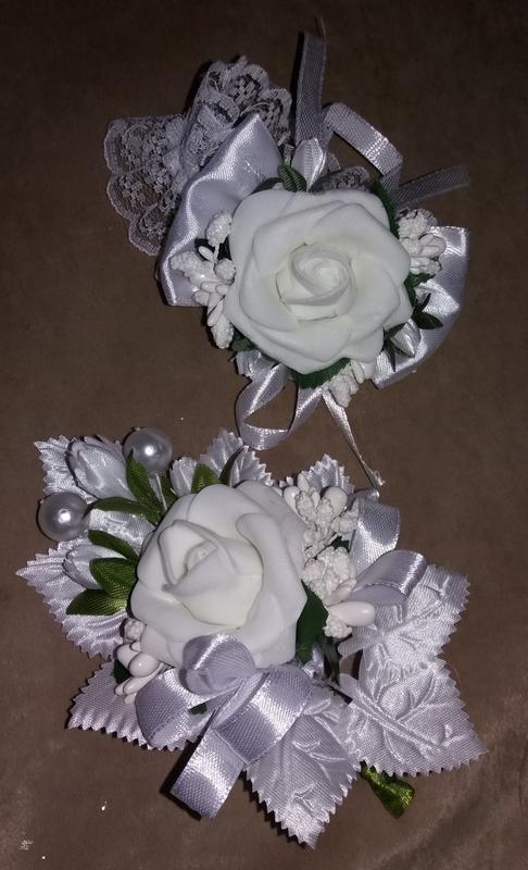 Комплект весільних бутоньєрок свідкам білого кольору (Арт. Ц-б-НМ-к-біл) — комплект урочистих квіток (чоловіча - для піджака та жіноча на ручку (браслет), виготовлена в білому відтінку під "живу квітку" з декоративними флористичними доповненнями. Ідеально підходить для тематичних весіль з використанням аксесуарів певного кольору. Матеріал — латекс, атлас, сітка, стрічка, намисто, дріт. Колір: білий