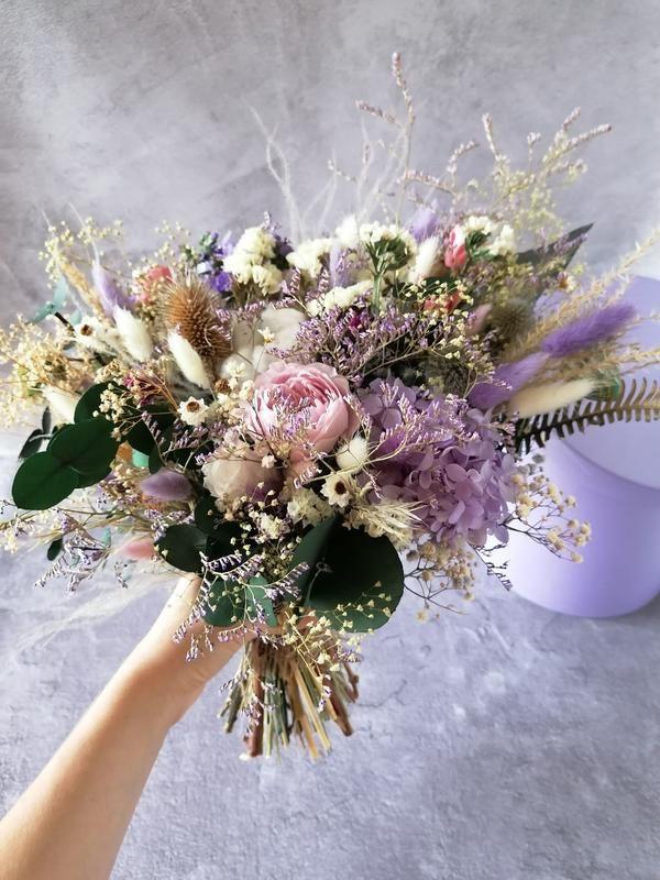 Нежный свадебный букет из сухоцветов и стабилизированных растений (предствален для примера): H 35 cм, W 35 cм. Не требует вазы и воды. Стоит самостоятельно. Создаю под заказ букеты и композиций по вашему желанию любого размера и в любой цветовой гамме. Букет не вянет, прекрасно сохраняет свои качества длительное время. При правильном хранении срок службы больше 1 года: держать вдали от прямых солнечных лучей а также любых отопительный приборов, беречь от сырости, сдувать пыль холодным воздухом фена. Также создаю подарочные композиции, любые свадебные аксессуары: бутоньерки, цветочные корсажи на руку, свадебные гребни и веночки. Товар под заказ