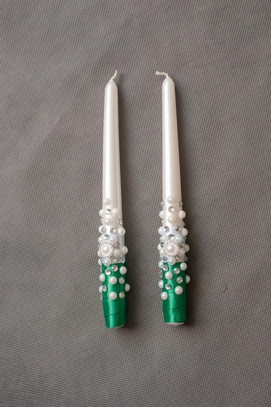 Свічки для вінчання. Задекоровані атласними стрічками та стразами. Ціна вказана за пару. Можливе виготовлення на замовлення у будь-яких інакших кольорах, а також виконання інших весільних атрибутів ( бутоньєрки для наречених, підв'язки, подушечки, бокали...) Матеріали: атласні стрічки, стрази Розміри: 24 см. Термін виготовлення: 2-5 днів Товар виготовляється на замовлення