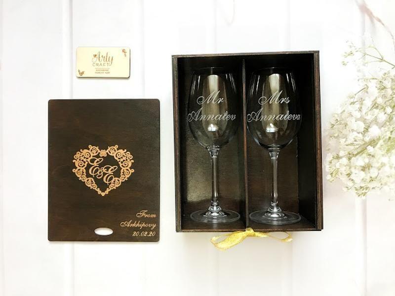 Эксклюзивные свадебные бокалы с индивидуальной гравировкой много лет будут хранить счастливые воспоминания о памятной дате. ❤️ Отличный подарок для молодожен, который они непременно оценят. Бокалы изготовлены из богемского стекла. Размеры и вес бокалов: Диаметр 5,7 см. Высота 22 см. Обьем 350 мл. На ваш выбор 24 вариантов дизайна гравировки (цена не меняется). На коробочку, при желании, можно нанести другой узор. Цвет коробочки предлагаем выбрать из нашей палитры деревозащитных лаков. Цена указана за 2 бокала с гравировкой и деревянную коробочку для бокалов с гравировкой инициалов. Гравировка может быть другая, возможен индивидуальный макет (+60-80 грн). Перед изготовлением высылаем макет на утверждение. При заказе указывайте, пожалуйста, в комментариях: 1) Номер макета для бокалов и необходимые данные. 2) Цвет тонировки лаком для коробочки и инициалы. Товар виготовляється на замовлення