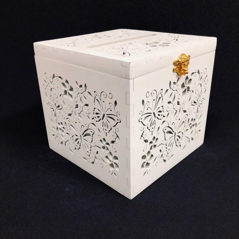Скриня весільний ажурний. Ця різьблена коробка може використовуватися для подарунків, побажань та інших весільних аксесуарів. Вона стане відмінною прикрасою інтер'єру і приємним нагадуванням про торжество або пам'ятну подію. Розміри: 20 см х 20 см, висота 19 див. Виконаний з мдф, товщиною 5 мм, з фарбуванням білим кольором.