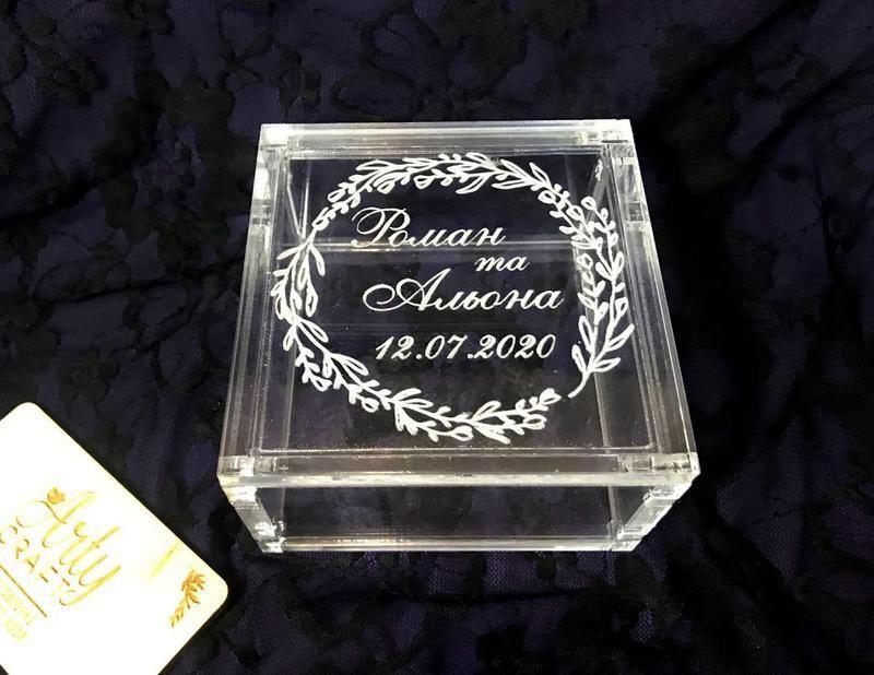 Шкатулка для колец с гравировкой имен и даты "Веночек" . Возможен индивидуальный дизайн. Размер 10х10х5 см. Материал - акрил, толщина 5 мм. Товар под заказ