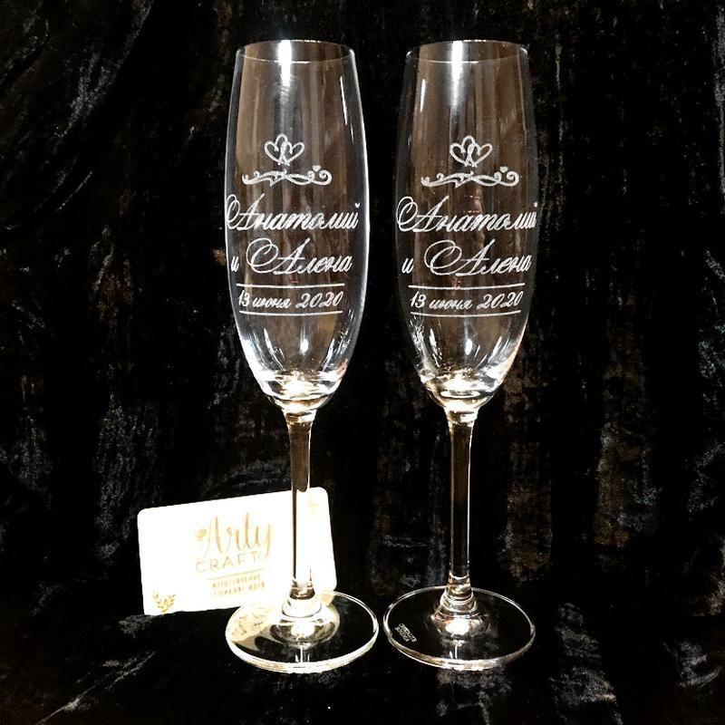 Два келихи для молодят на весілля з гравіюванням. Келихи виготовлені з богемського скла. Розміри і вага келихів: Діаметр: 4,5 см Висота: 24 см Об'єм: 230 мл Ціна вказана за 2 келихів з гравіюванням. На ваш вибір 24 варіантів дизайну гравіювання (ціна не змінюється). Приклад роботи гравіювання на келихах на фото. Гравірування може бути інша, можливий індивідуальний макет (+60-80 грн). Товар виготовляється на замовлення
