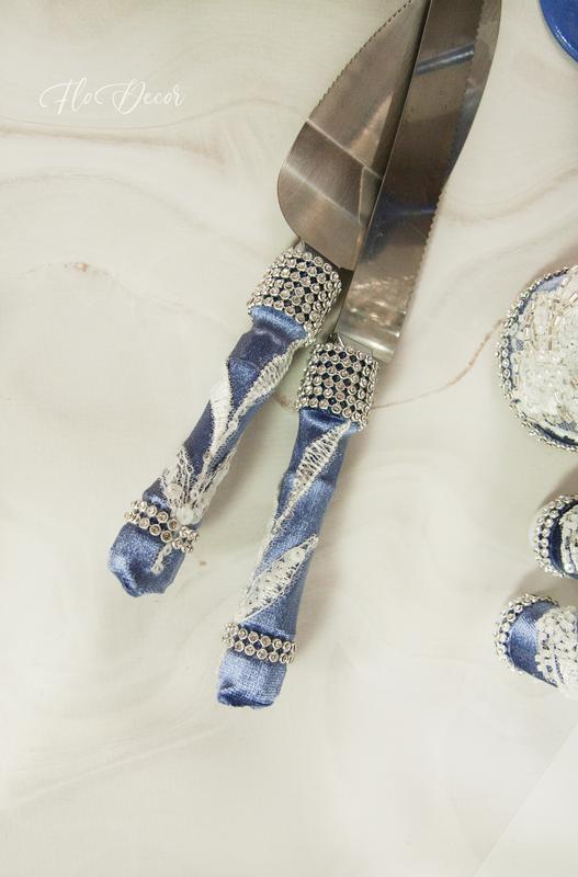 Нож и лопатка для резки свадебного торта. Декорированы бархатом и люксовым кружевом, расшитое бисером и пайетками. Возможно исполнение в другом цвете. Подробнее в приват. Товар под заказ