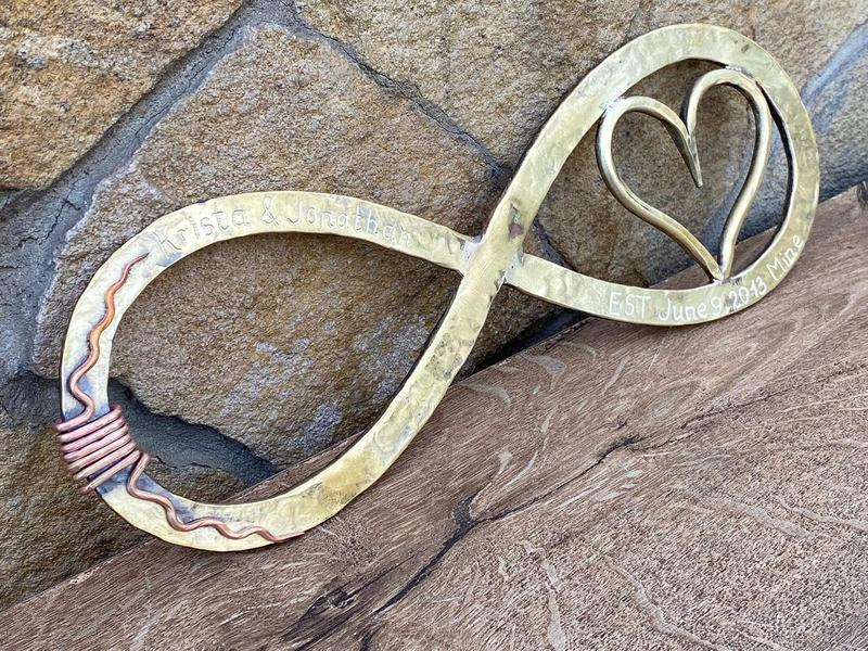 Вот прекрасный знак бесконечности ручной ковки из бронзы, украшенный бронзовым сердцем и изящной медной проволокой. Это идеальный подарок на 8-ю годовщину свадьбы (бронзовая годовщина), 19-ю годовщину свадьбы, а также для выражения любви, на помолвку, День Святого Валентина и многие другие особые события! Размеры: длина - 30,5 см высота - 11 см Цвет: не крашеный, чистая бронза. Изготавливается из 100% бронзы. Ручная работа. Достаточно тяжелый для своих размеров! В некоторых местах он может иметь тени другого цвета в результате окисления бронзы (подтверждение того, что он из чистой бронзы).