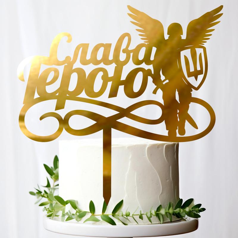 Золотой топпер слава герою (янгол з мечем та щитом)" 14х14см из зеркального полистирола то...