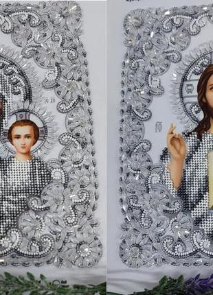 Иконы из бисера и камешков: Божья Матерь с Ним и Спасателя. Изящная отделка, блестящие детали, выглядят празднично и станут хорошим подарком или украшением дома. новые вышитые иконы размером А4 из бисера и бусин без рамы