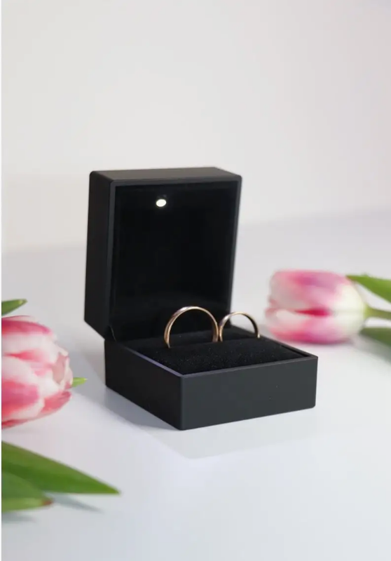 Шкатулка для обручальных колец, кольца с подсветкой Размеры: ширина 5,8 см, длина 6,2 см, высота 3,8 см Цвет: черный Покрытие: матовое Цвет подсветки: белый Материал: пластик