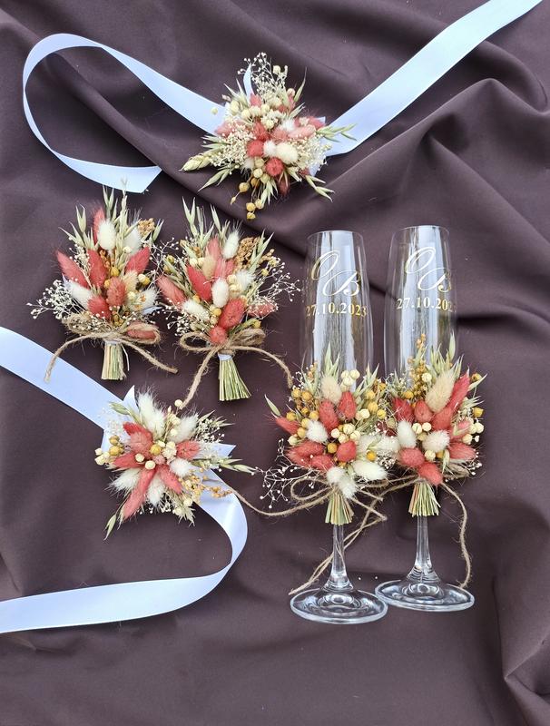 Свадебный набор с сухоцветами. Можно заказать как вместе так и все по отдельности. Изготовление под заказ. Цвет может быть другой. На фото бокалы с сухоцветами и бутоньерки для невест и показаний. Работаю по предоплате.