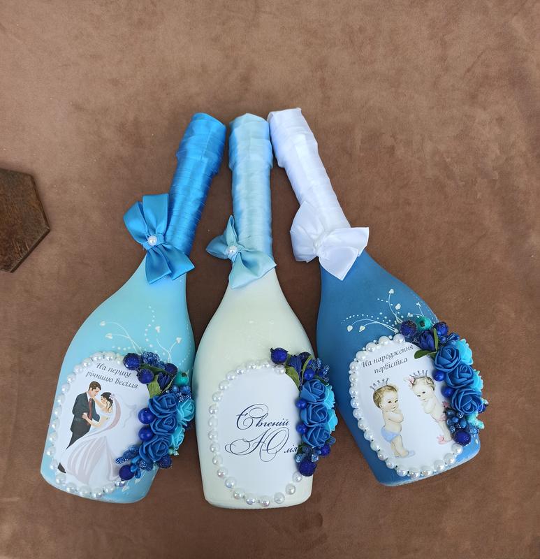 Шампанское для Женственных. В набор входит три бутилочки. На рождение первистка, на первую годовщину свадьбы, и с именами невестных. Изготовление под заказ. Цена указана за набор из 3 бутилок.