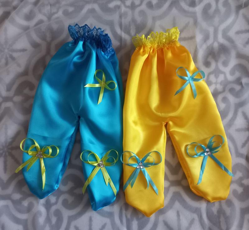 Ползунки для конкурса "мальчик-девочка" желто-голубые - ползунки на свадьбу, из атласа, кружев и забавных пышных бантиков со стразами - яркий аксессуар для свадебных конкурсов! Цена - указана за пару (2 шт.).
