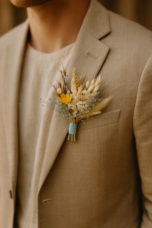 Бутоньерка из сухоцветов в желто-голубых тонах, бохо стиль, для свадьбы или фотосессии